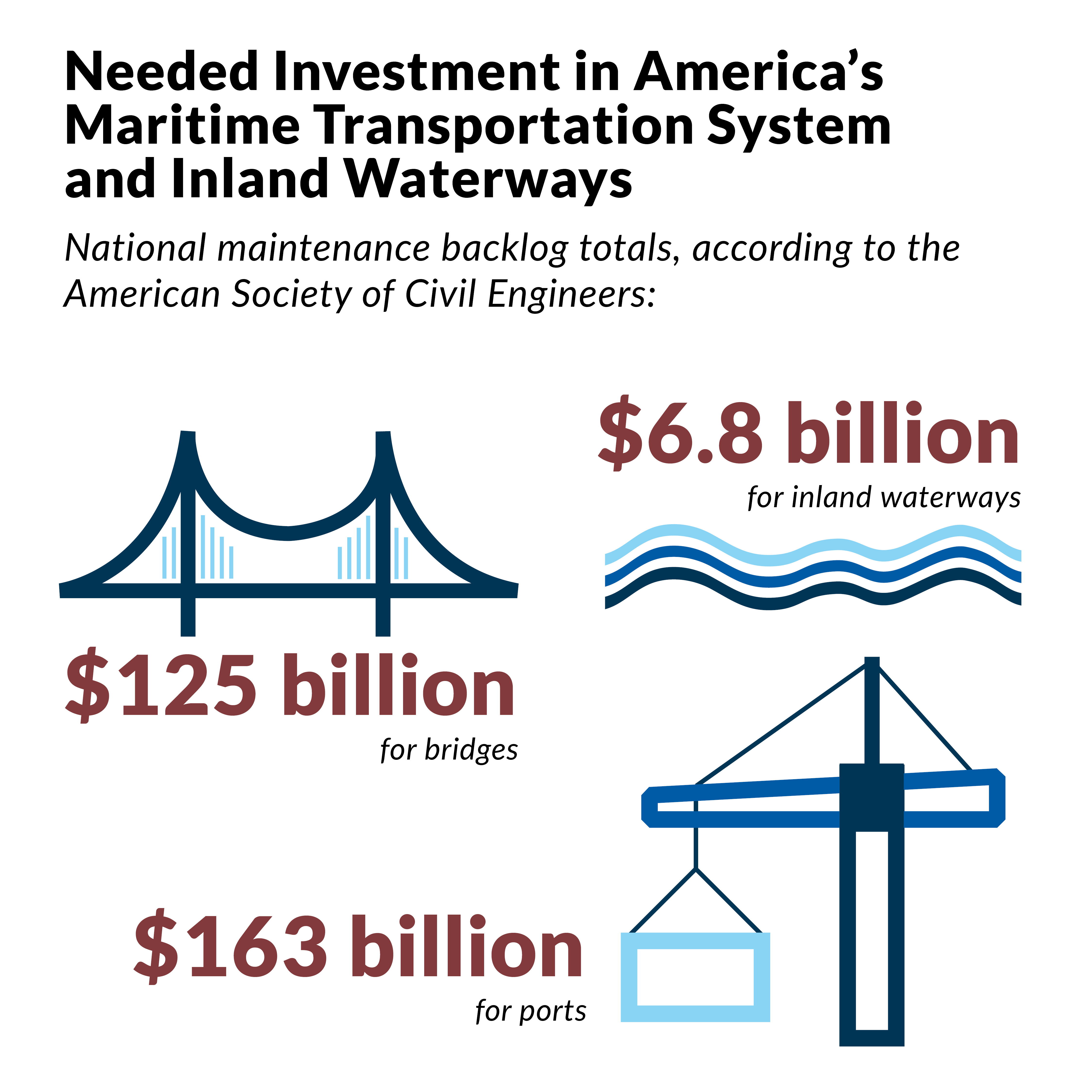 Urge investment in America’s Maritime Transportation System and inland waterways. Address the national maintenance backlog, which according to the American Society of Civil Engineers, amounts to $125 billion for bridges, $163 billion for ports, and $6.8 billion for inland waterways.