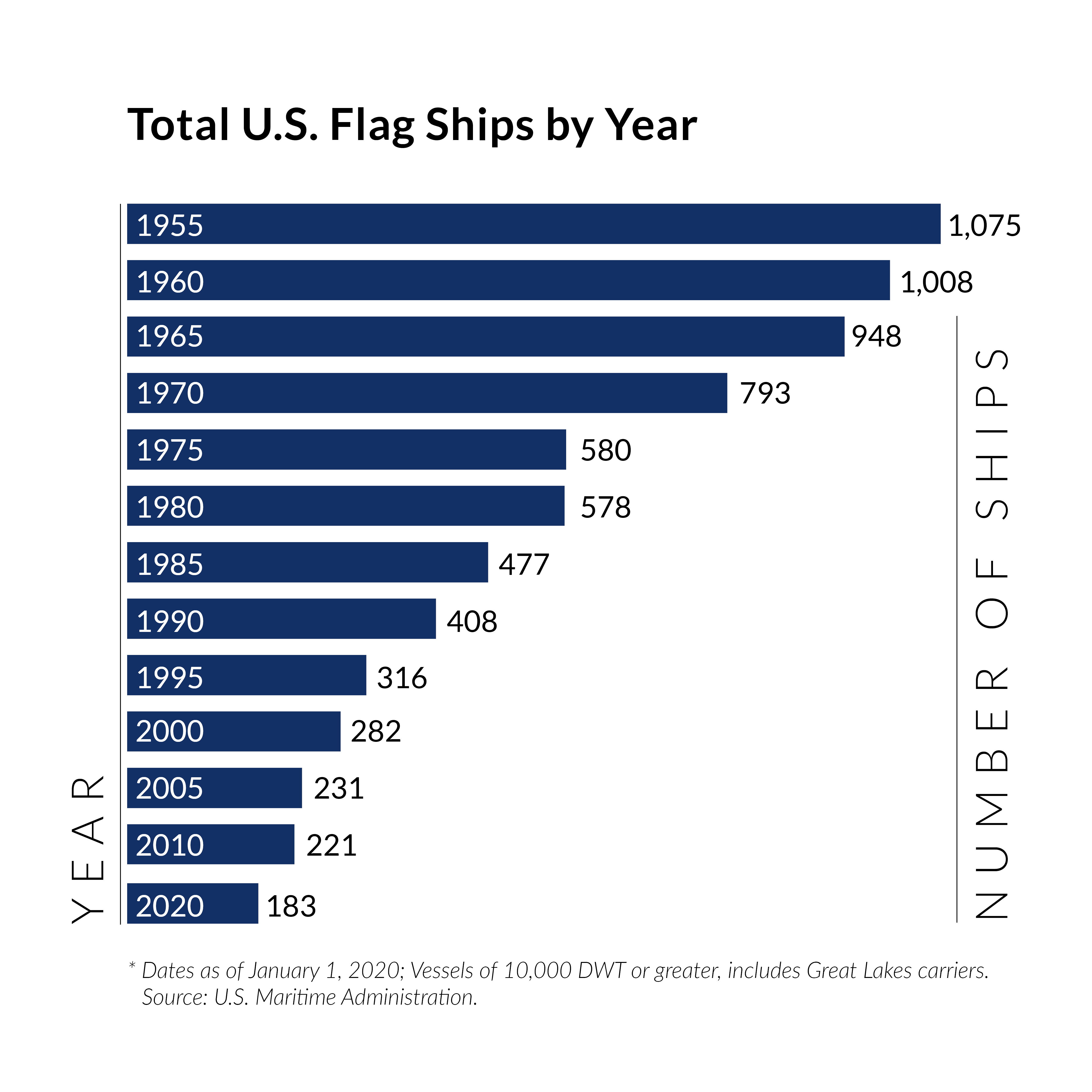 The nation can no longer deploy and sustain forces in protracted wartime operations since the 187 large oceangoing U.S.-flag ships operating in foreign and domestic trades are at least 50 ships (based on a 2017 study) short of being able to provide the pool of skilled U.S.-citizen merchant mariners to crew each commercial and government-owned reserve sealift vessel during protracted wartime operations.