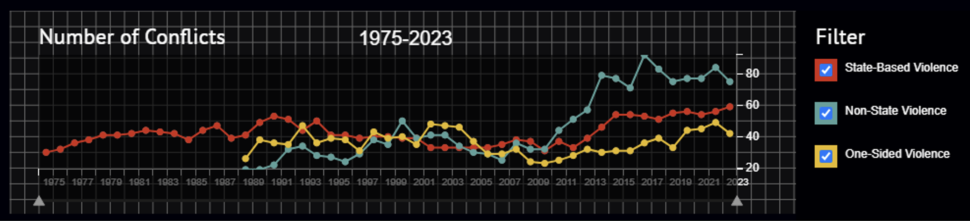 Expanding on this global perspective, a review of the latest data from the Uppsala Conflict Data Program from the Department of Peace and Conflict Research at the Uppsala University in Sweden shows that there are over 200 various types of armed conflict around the world all the time—and this statistic has grown dramatically over the past 20 years. And the most sobering statistic—over 3.3 billion people have died in armed conflicts around the world over the past 35 years.