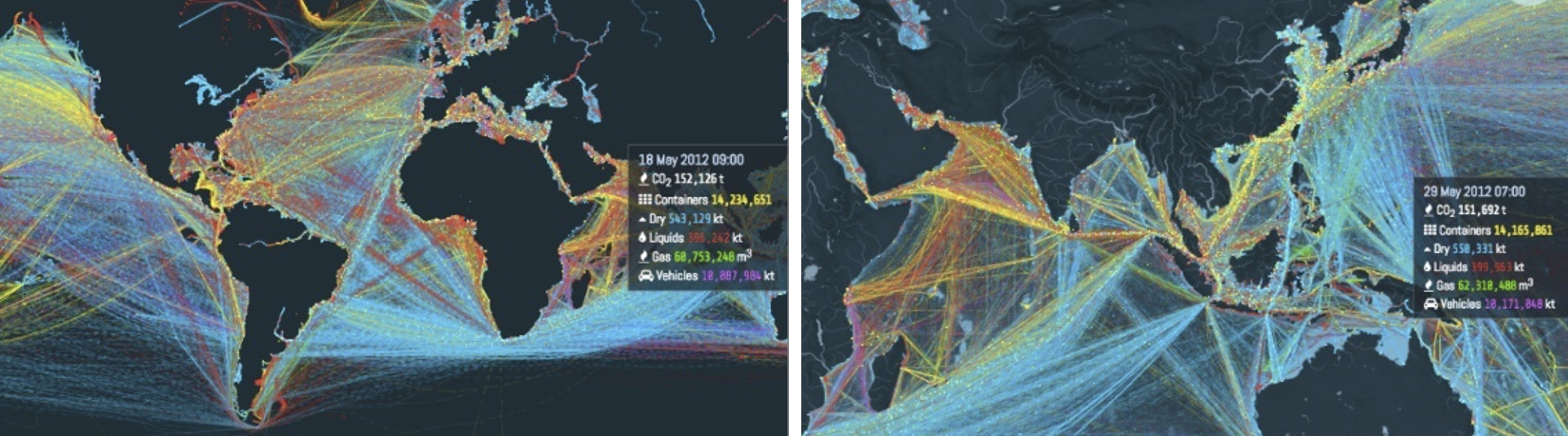 So given the above statistics, it is also important to look at how the nations of the world are using the maritime environment. Here are two graphics of the maritime shipping lanes that show just how critical the maritime commons are to the economic security of our nation and the rest of the world.