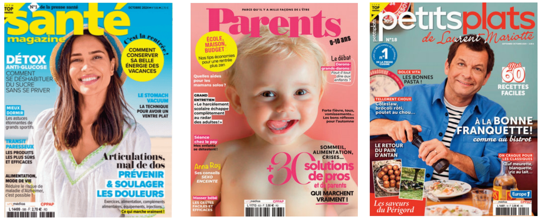 Avant l’acquisition de We demain, Uni-médias exploitait dix marques médias dans quatre univers différents : le féminin et la santé (avec Santé magazine, Plus de pep’s et Parents), l’art de vivre (avec Régal, les Petits plats de Laurent Mariotte, Détente jardin et Maison créative), la culture-découverte (avec Détours en France et Secrets d’histoire) et le droit-consommation avec Merci pour l’info). « Entre nous, on parle d’un pôle famille (Parents, Santé magazine, Merci pour l’info, Pep’s) et d’un pôle art de vivre (tous les autres) », précise Nicole Derrien. Les rédactions (un peu moins de 50 journalistes) représentent une petite moitié des effectifs du groupe.