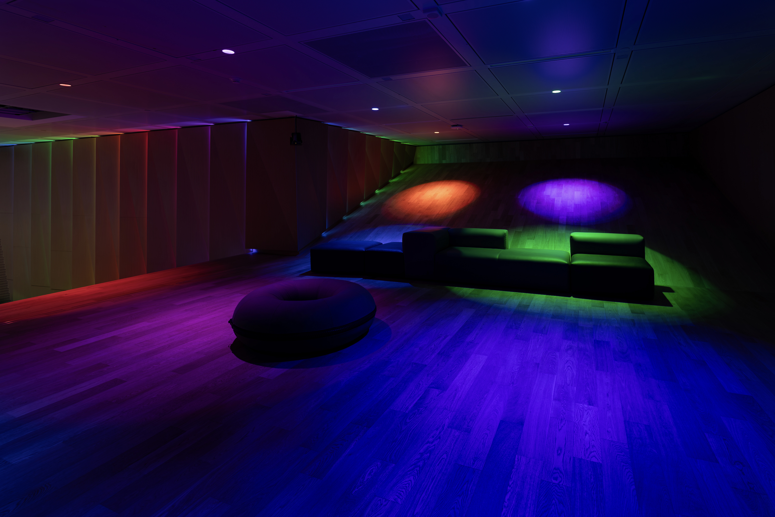 The control interface was designed with the end user in mind. In the A/V control room, a DMX control panel with intuitive sliders and clearly labeled buttons allows for effortless scene selection and real-time adjustments. Pre-set programs inspired by the color palettes of Kabam’s most successful games—such as Disney Mirrorverse and Marvel Contest of Champions—can be activated for company events, presentations, or celebrations, instantly transforming the atmosphere.