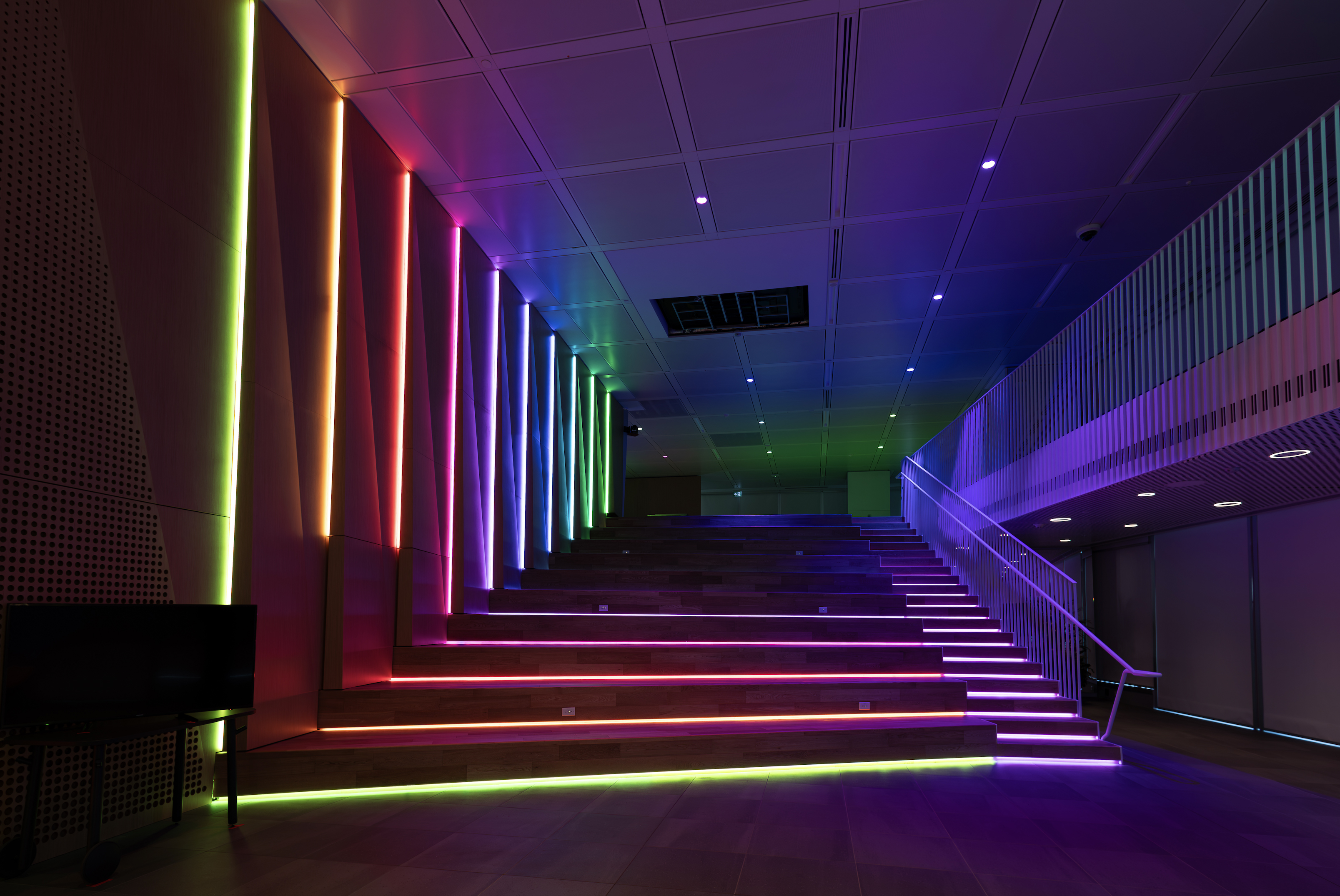 The architectural language of the office, crafted by Perkins&Will, presented its own set of opportunities and constraints. Intricate millwork on the atrium’s feature wall and the grand staircase called for lighting solutions that could highlight these elements without overpowering them. The design team responded by integrating U Technology RGBW tape into seat toe kicks, stair risers, and behind wall panels, creating a concealed wash of color that animates the wood surfaces and brings the space to life.