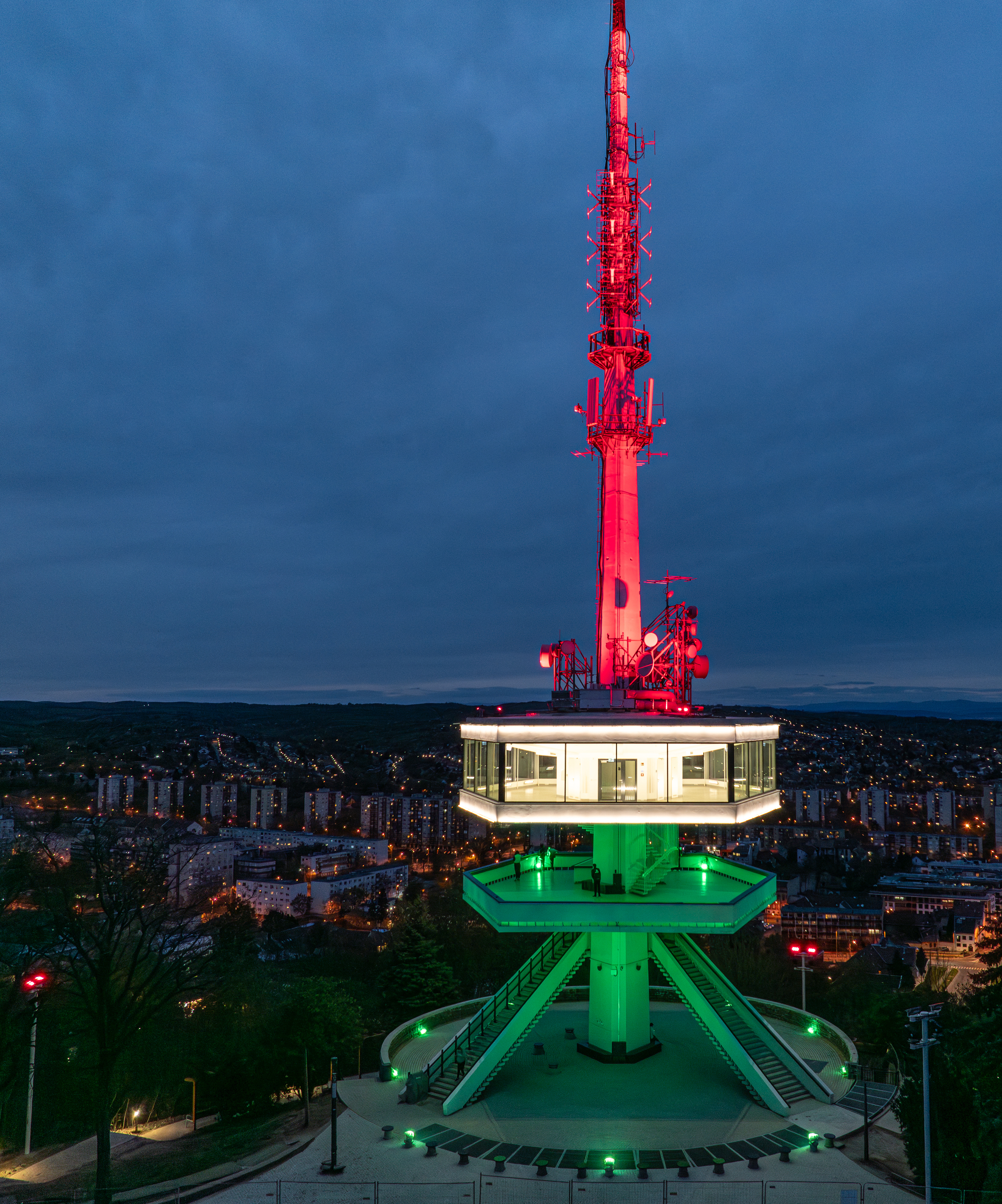 The 72-meter (~236-ft) Avas Lookout Tower in Miskolc, Hungary, shines bright with a new decorative lighting system to commemorate cultural events throughout the year and increase the energy efficiency of the historic site. A four-universe Pharos Designer LPC—implemented by designer and installer company Lisys-Project—can be accessed by city officials remotely via an integrated 3G/4G router to swap out color schemes such as that of the Hungarian flag seen here.
