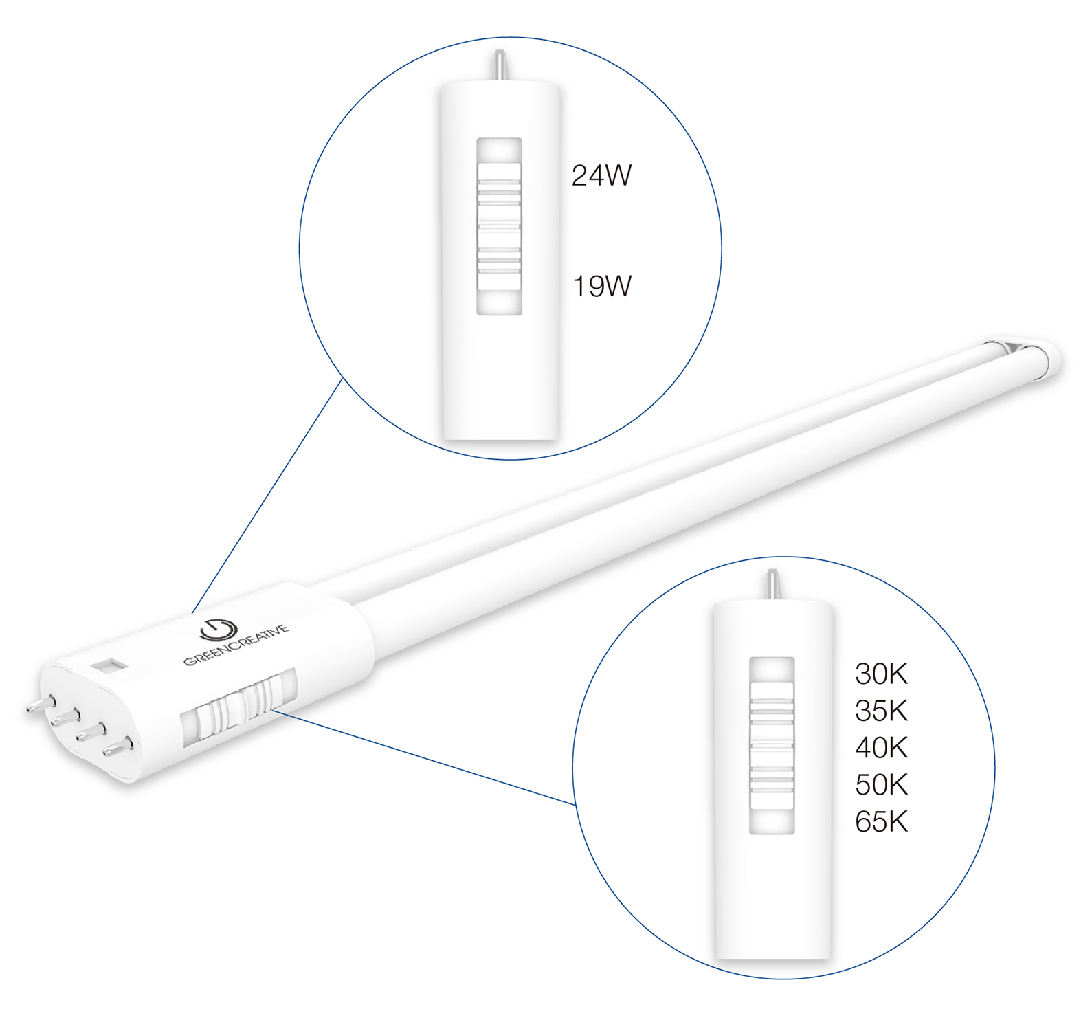 Power and CCT select Hybrid PLL lamps from GREEN CREATIVE are a first-to-market LED replacement for 50- or 55-watt, 4-pin 2G11 base compact fluorescent lamps. The lamps can be installed directly with compatible instant start or programmed rapid start electronic ballasts or by bypassing the ballast and connecting directly to line voltage input. They have selectable wattage features, a selectable CCT ranging from 3000K to 6500K, and an average L70-rated life of 50,000 hours.