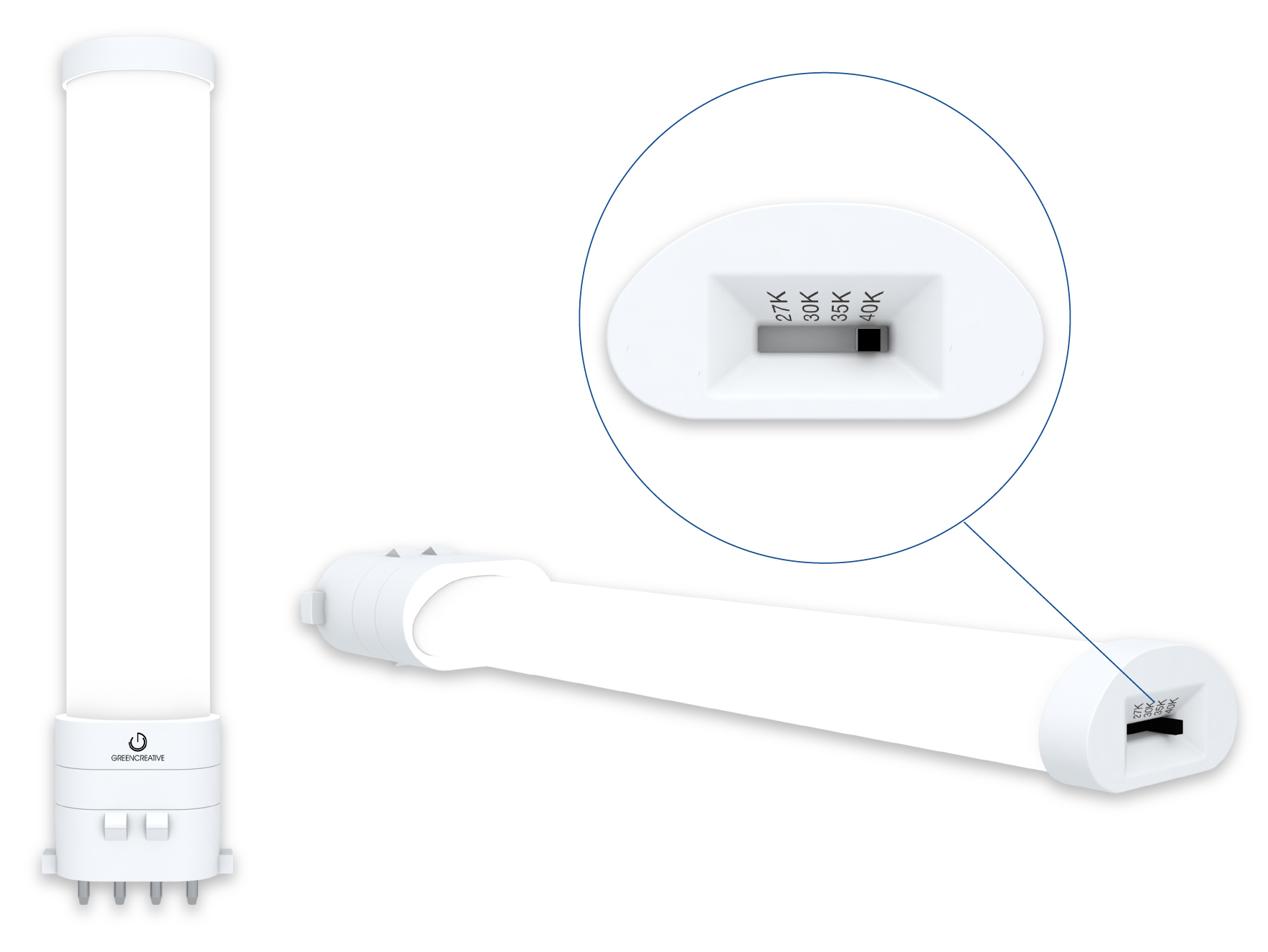 GREEN CREATIVE’s CCT Select Bypass and HYBM PLS LED lamps are recognized for an industry-leading lifetime of L70-rated, 70,000 hours. Available in G23 and GX23 base types, which are compatible with magnetic ballasts or G23, GX23, 2G7, or 2GX7 types for ballast bypass installation, the lamps also feature a selectable CCT range from 2700K to 4000K.