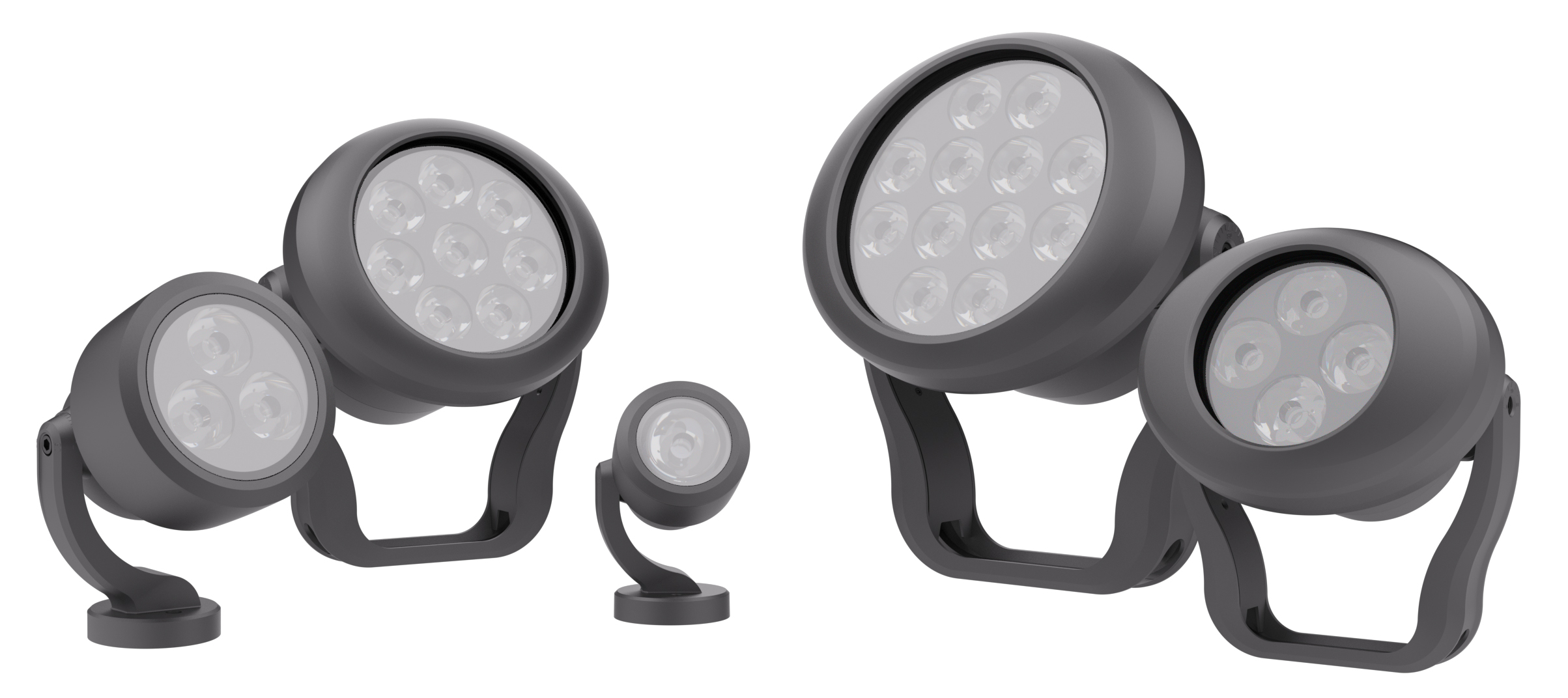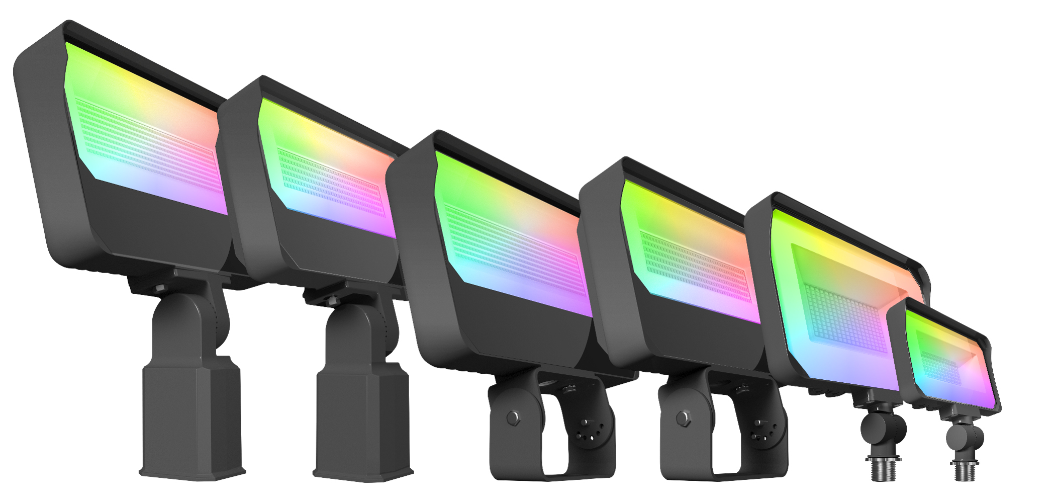 RAB Lighting’s X34 RGB is a high-efficacy RGBW floodlight and also Bluetooth controlled. With sizes ranging from 4.5 in. to 12 in. wide, this family can produce up to 24,000 lumens. Multiple mounting options are available, and it is UL Listed for ground mounting applications below 4 ft. The fixture is also available with static-white output.