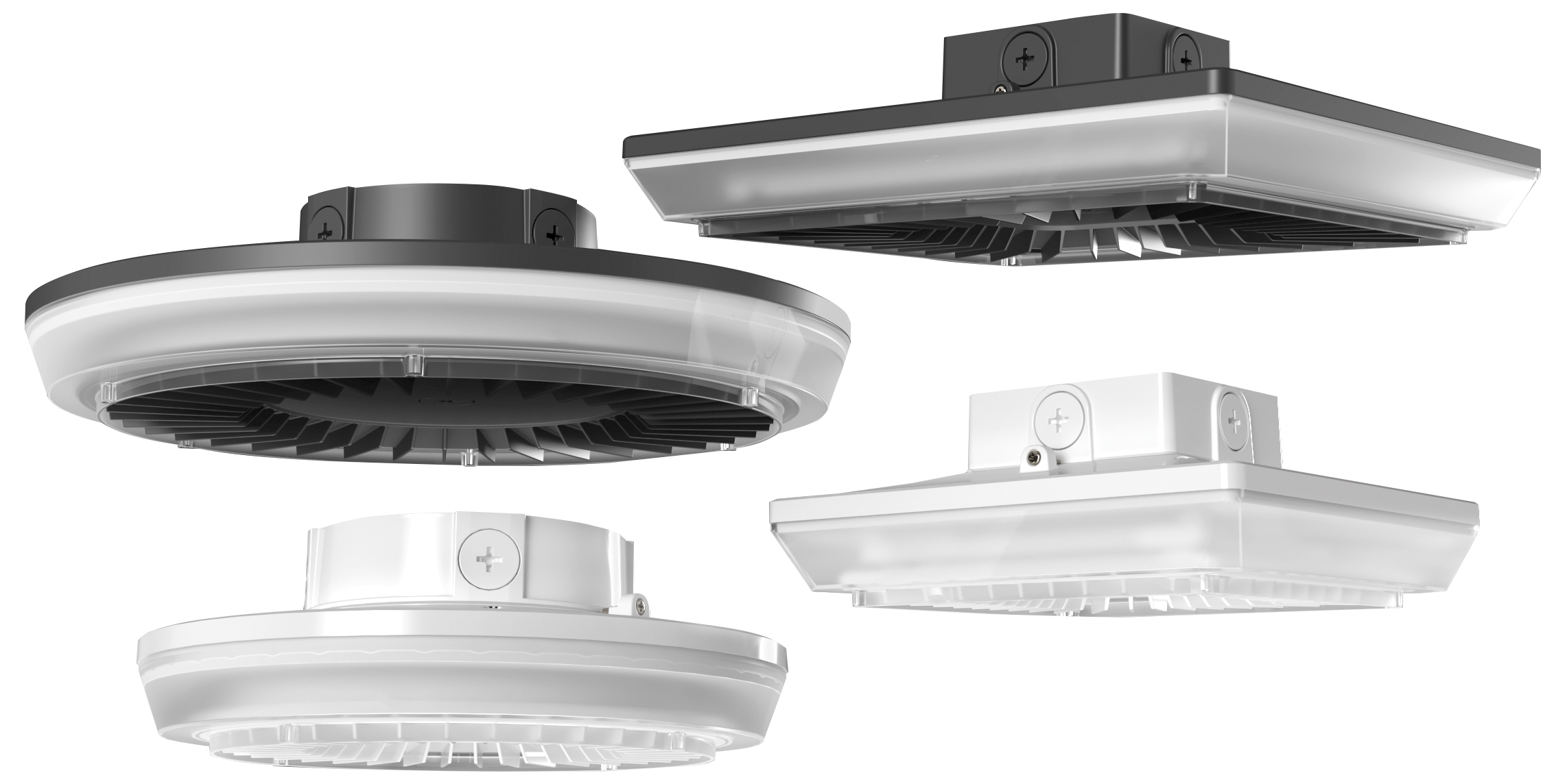 The PORTO Field-Adjustable Garage Light from RAB Lighting has efficacy up to 150 lm/W and field-adjustable color temperature and lumen output. An integrated photocell is included. The cave effect in parking garages is reduced with this fixture’s 30% uplight. Available in two round and two square sizes, the fixture offers lumen output ranges from 4,200 to 14,800.