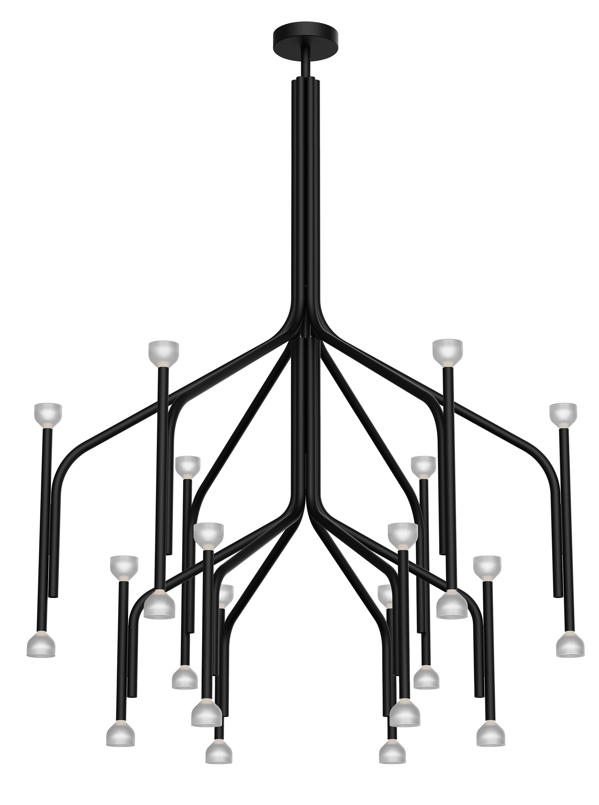 7. Eureka announces Tulip, a collection of decorative chandeliers, pendants, and surface-mount fixtures with three acrylic diffuser options: Bud, a frosted diffuser for broad illumination (pictured); Bulb, a recessed lens; and Blossom, a frosted diffuser with a soft, elegant glow. Comprising metal tubes, the flower-inspired chandelier is available in 18-, 34-, and 48-in. diameters, with an option for the smallest and largest offerings to be combined to form a two-tier signature chandelier (pictured).