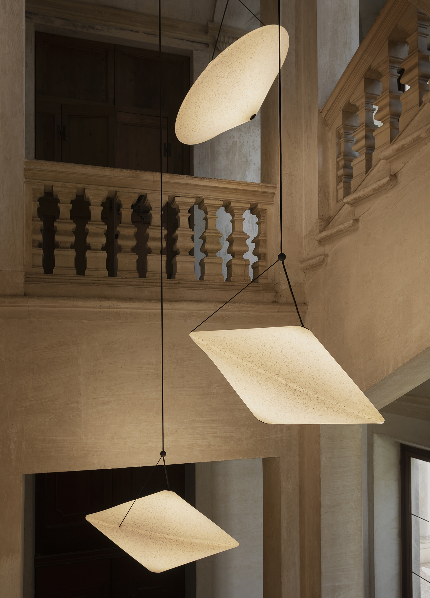 6. Miniforms debuts Rificolona, a recycled lamp designed by Tuscany-based studio e-ggs. Comprising recycled polyethylene from industrial and household waste, the translucent and lightweight ceiling luminaire is adjustable via two support cables and can hang at any angle. Luminaires are offered as ceiling, floor, and desk fixtures in three sizes.