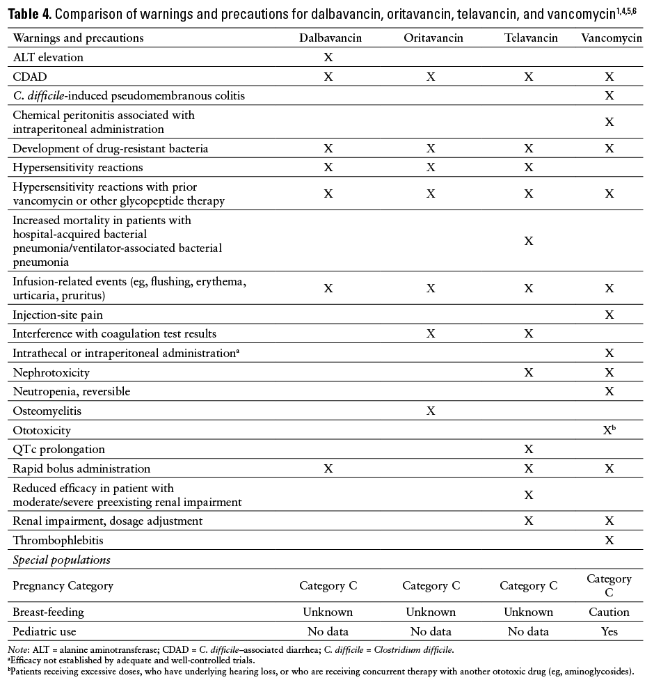 Warnings and precautions for medications used in the treatment of acute bacterial SSSIs are summarized in Table 4. Only telavancin has a required black box warning regarding patients with preexisting moderate/severe renal impairment treated for hospital-acquired bacterial pneumonia/ventilator-associated bacterial pneumonia, the risk of nephrotoxicity, and pregnancy test recommendations.1,4-6