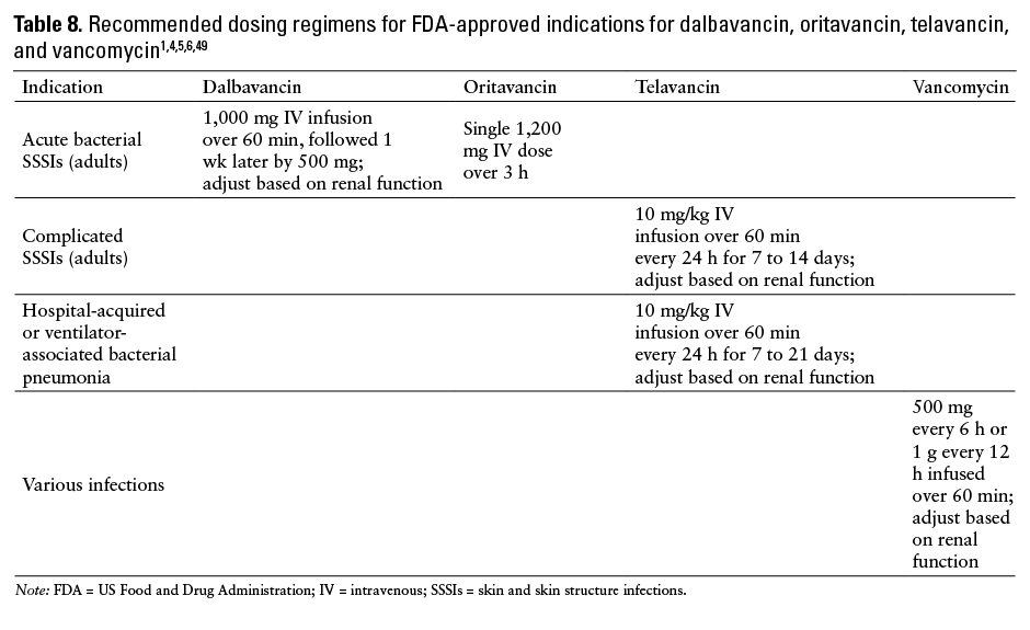 See Table 8 for a comparison of recommended dosing regimens for the various glycopeptide antibiotics.