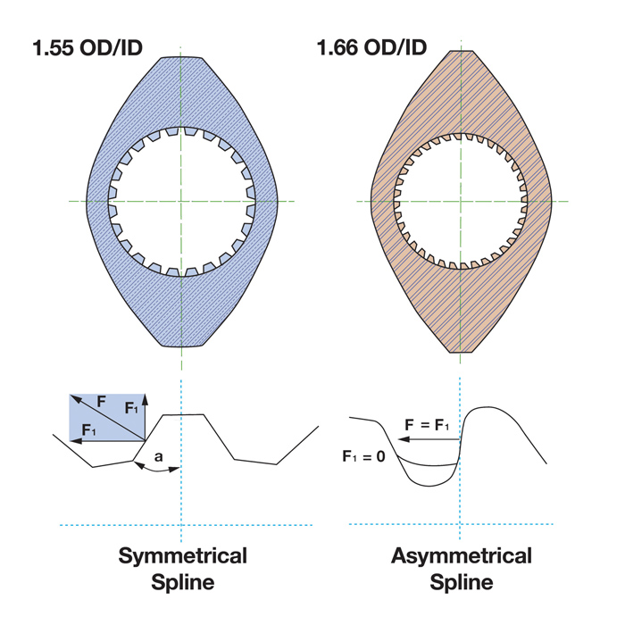 An asymmetrical splined screw shaft allows a higher free volume with an outer/inner diameter (OD/ID) ratio of 1.66, up from the traditional standard of 1.55 possible with a symmetrical splined shaft (diagram courtesy of Leistritz; see also p. 34 of the February 2014 Plastics Engineering for more about a related topic).